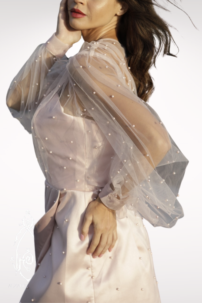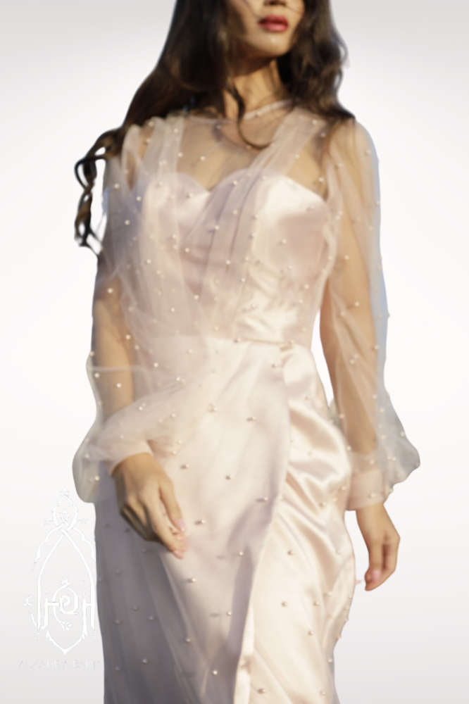 فستان سهرة دستي بنك مزين لؤلؤ  كسرات كم طويل