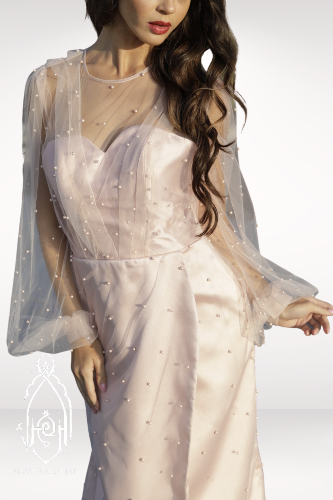 فستان سهرة دستي بنك مزين لؤلؤ كسرات كم طويل
