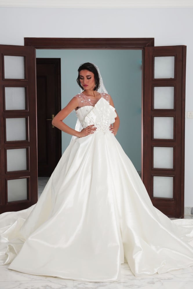 فستان زفاف , لون اوف وايت من التفتة و بقصة من الأعلى بالضافة الى التطريز اليدوي و التل الوردي على الأكتاف.