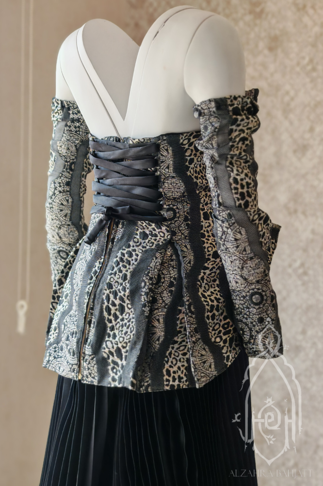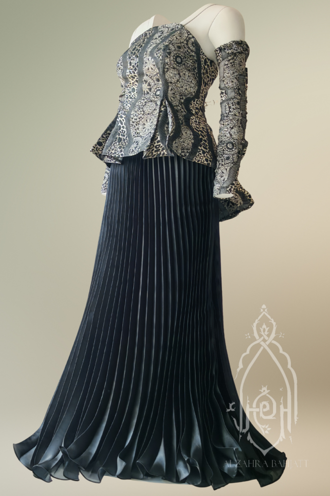 يتميز بكورساج مطرز بتفاصيل دقيقة تزيد من فخامته، ويكتمل التصميم بجيب بليسيه طويل ينسدل بانسيابية راقية ليضفي على الإطلالة حضورًا مميزًا.