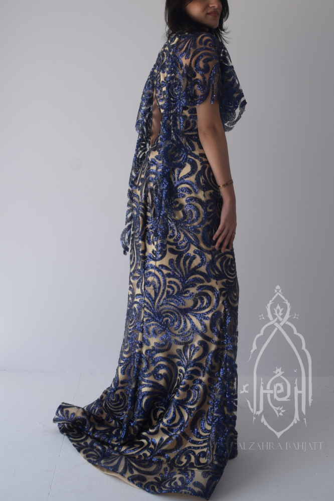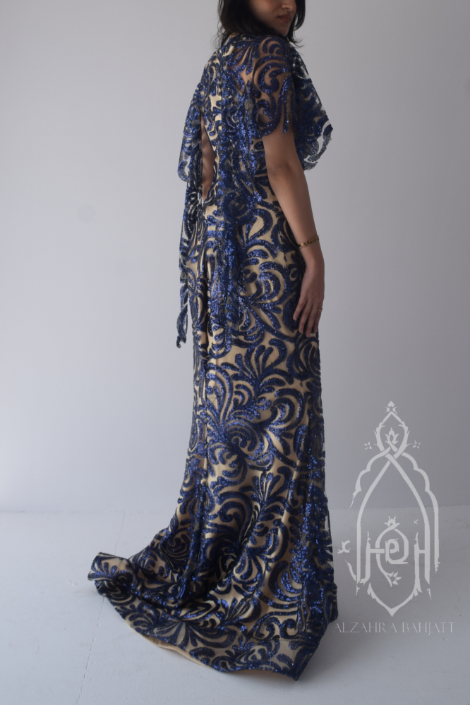 فستان سهرة قصة سمكة من التطريز كامل بالترتر الأزرق ومبطن باللون البرونزي