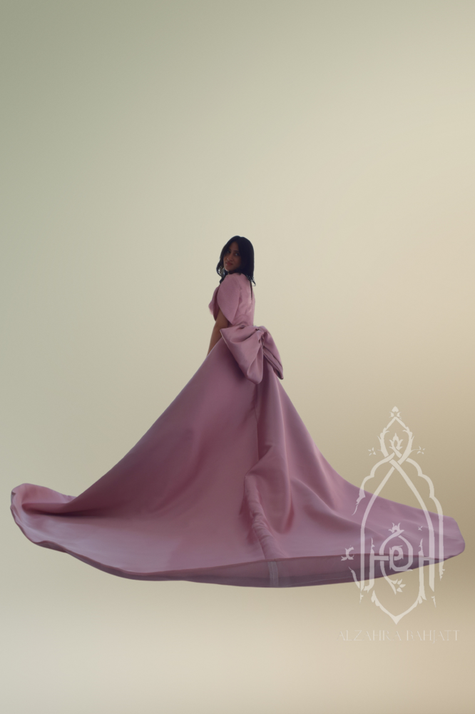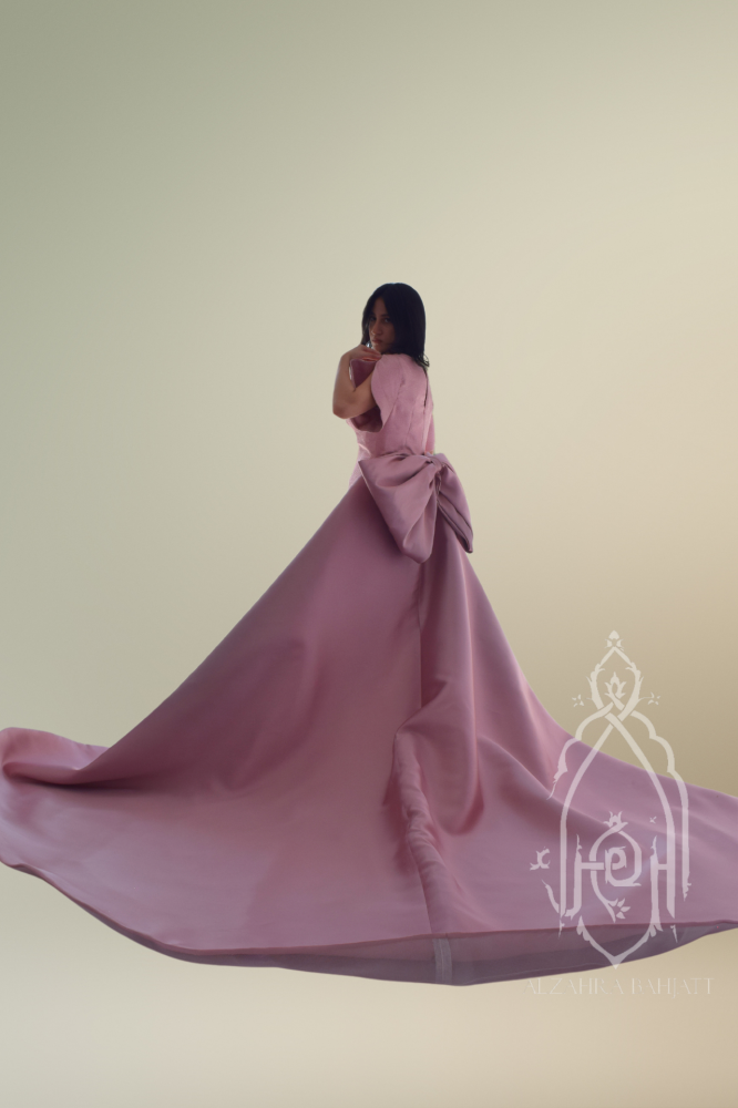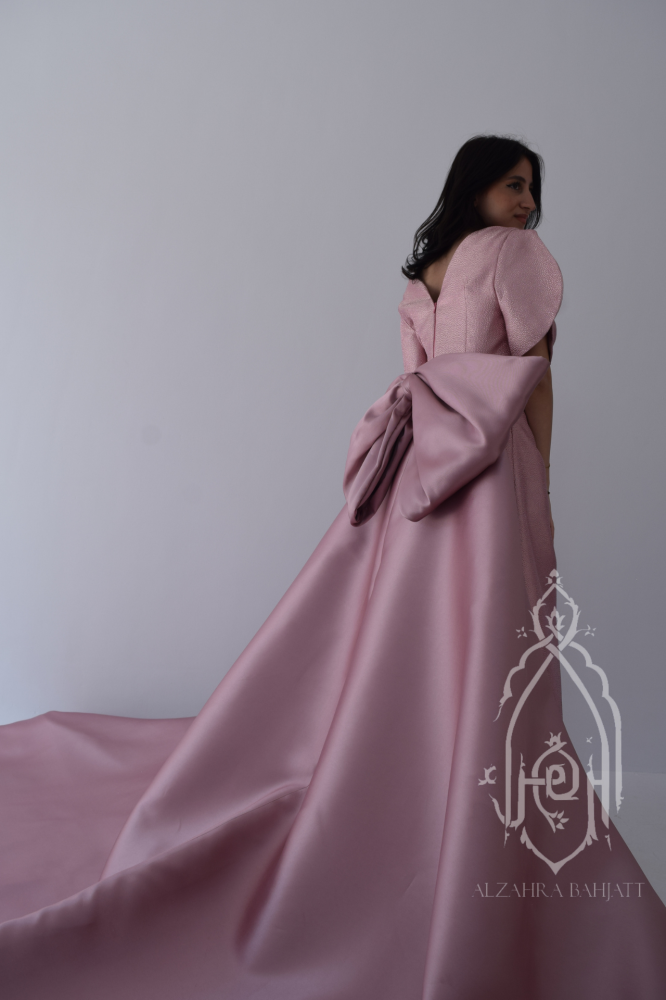 فستان سهرة جاكار وردي قصب مع ذيل متحرك وفيونكة