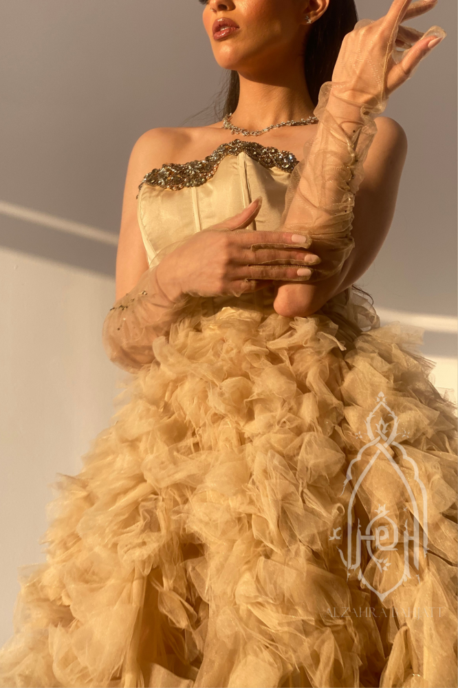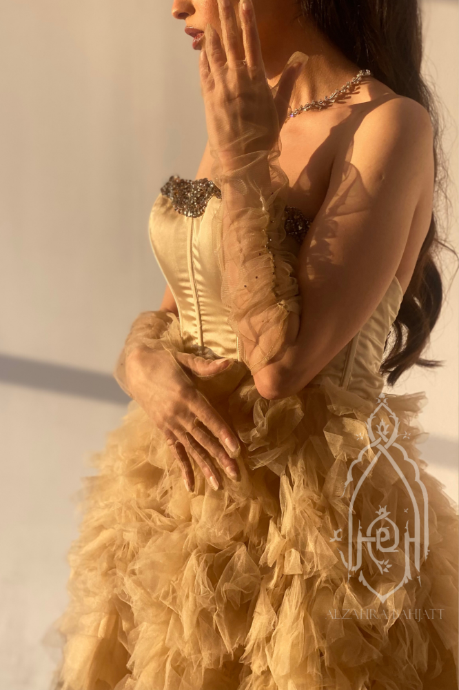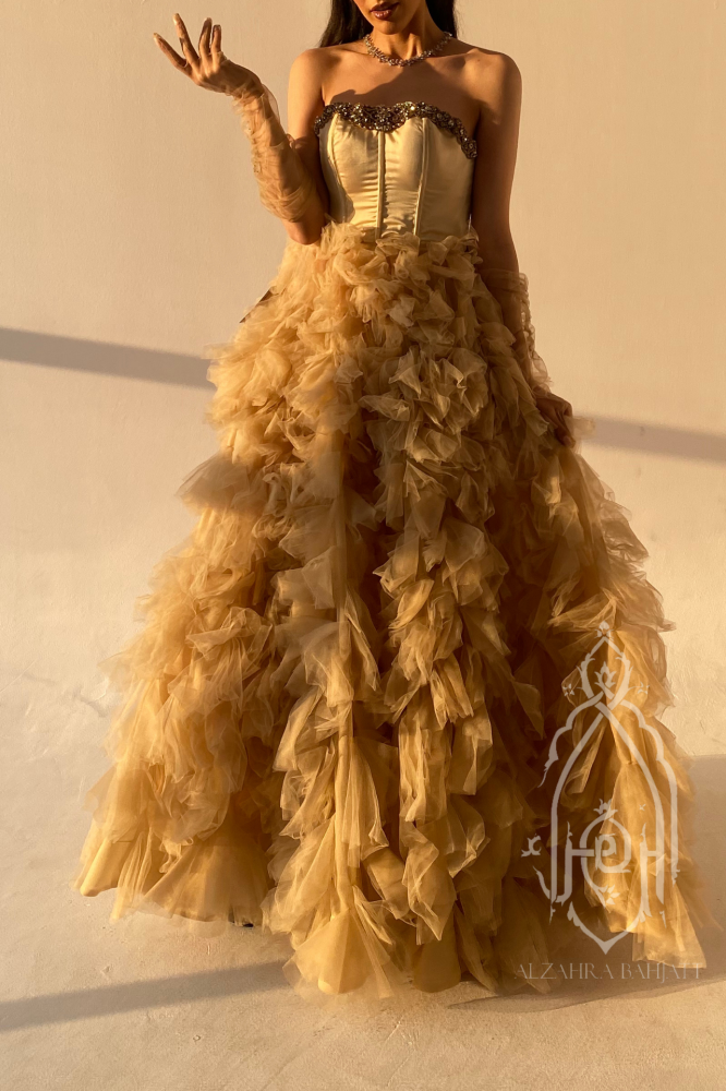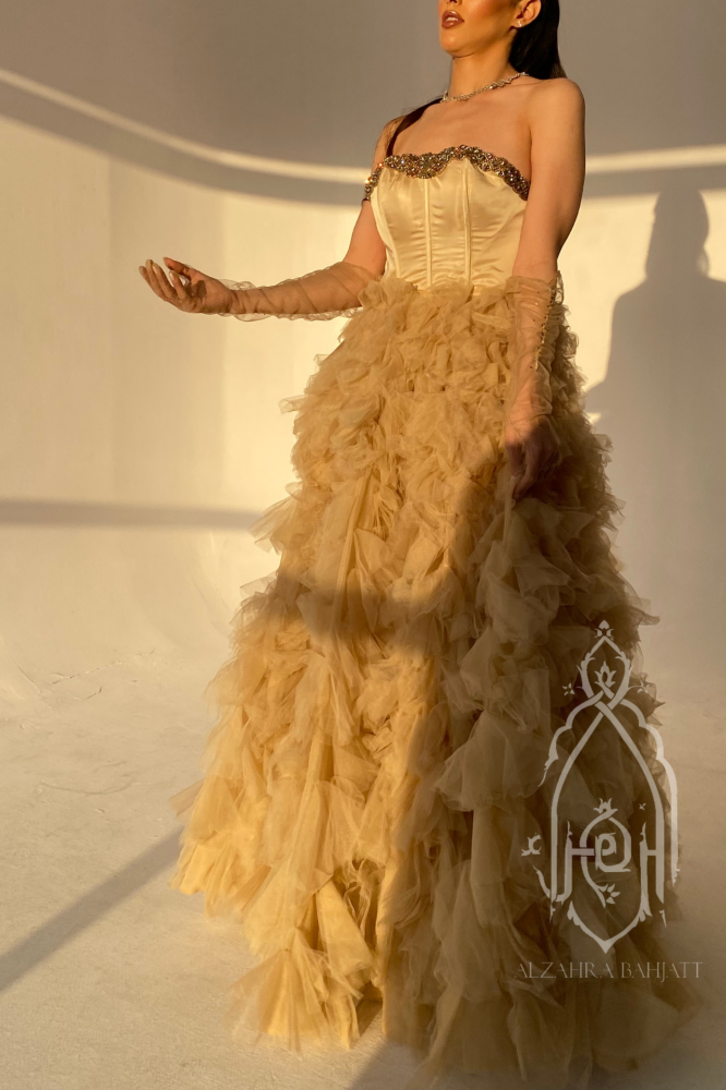 فستان سهرة كورساج مطرز بالكريستال وكلوش تل ورود