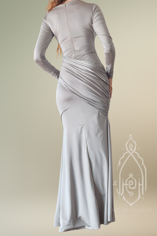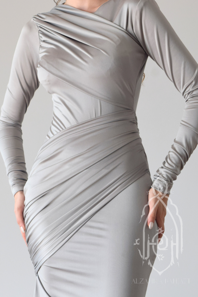 FR-521 فستان سهرة أنيق رمادي بقصة ضيقة وتفاصيل درابيه فاخرة