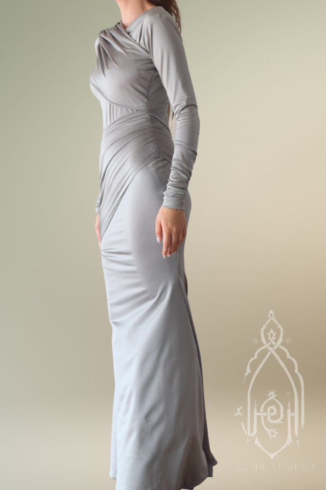 فستان سهرة فاخر باللون الرمادي الأنيق مصمم بأسلوب ضيق ينسدل بانسيابية ليعانق القوام برقي.