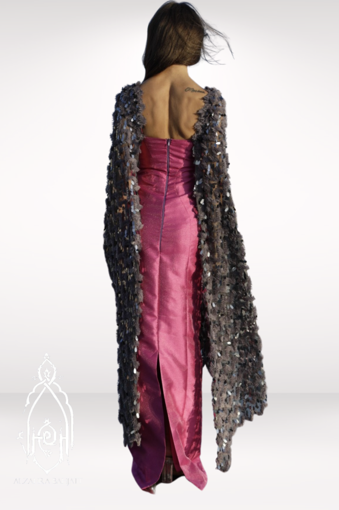 بقصات مائلة مع أكمام تل وترتر رمادي بارز و الصدر مزين فصة v مزين بارز رمادي