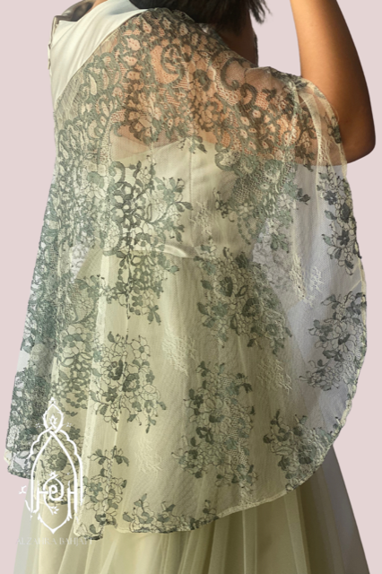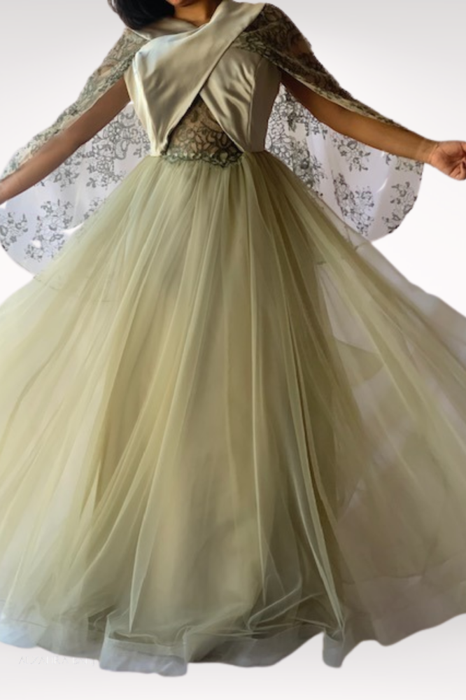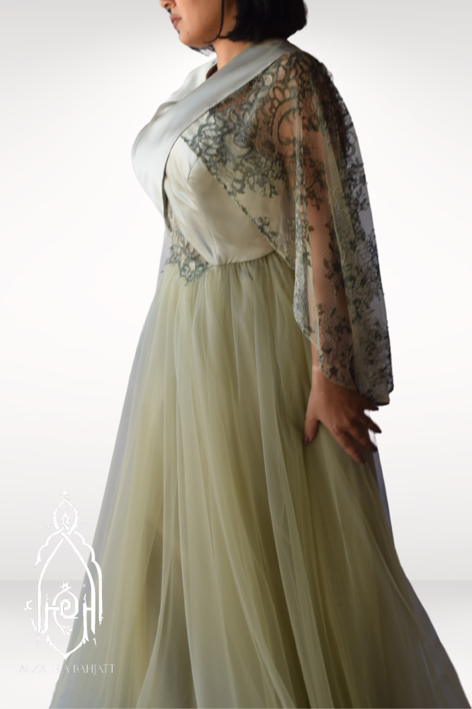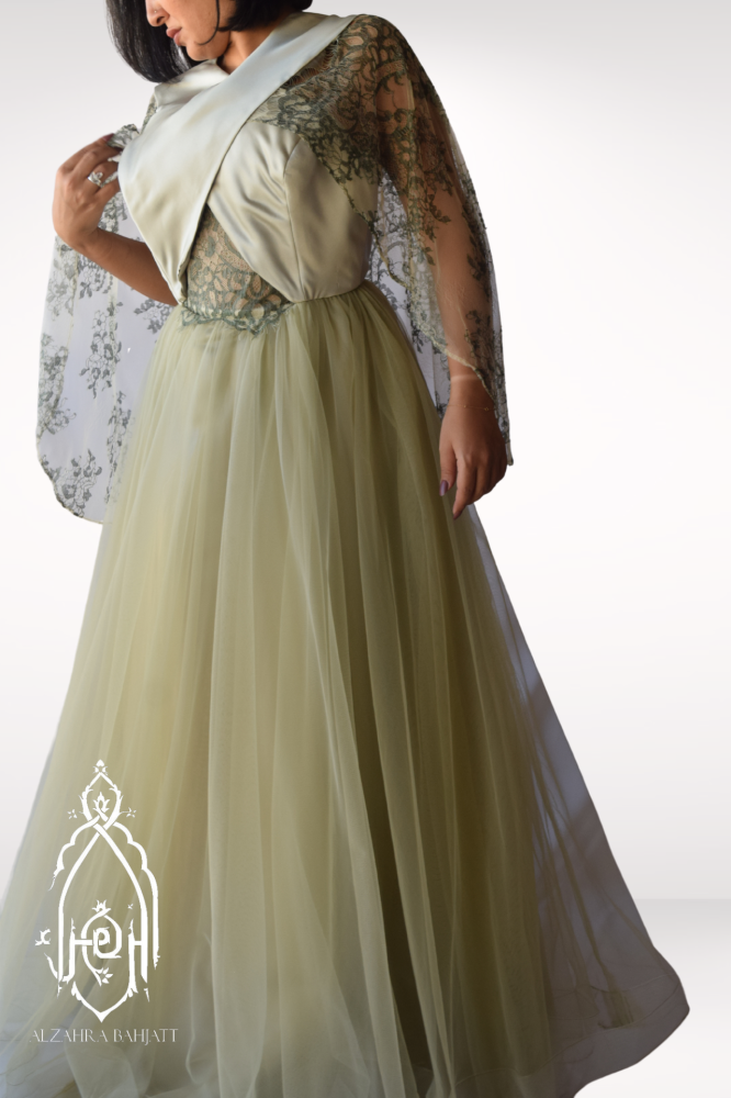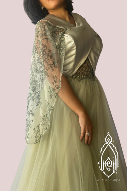 تالقي بفستان سهرة زيتي باستيل من التل و الدانتيل الفاخر المزين على الأكتاف مثل الكاب