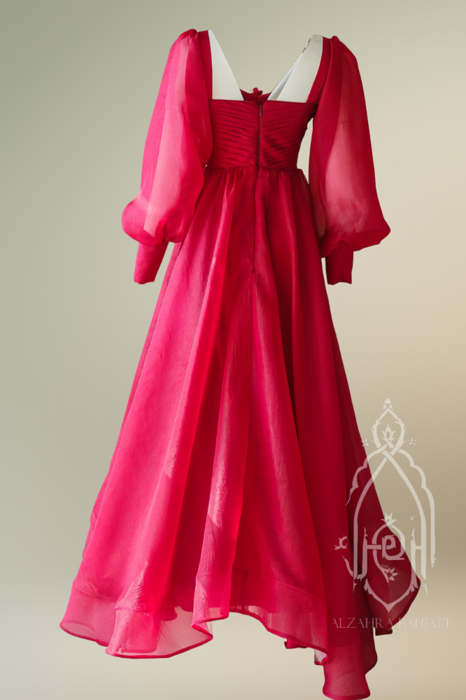 FR-516 فستان أحمر طويل من أورغانزا بأكمام منفوخة