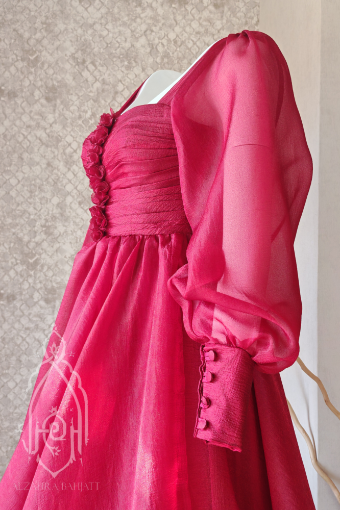 فستان سهرة راقٍ من الأورغانزا الفاخرة باللون الأحمر الجذاب، يجمع بين الأنوثة والفخامة.