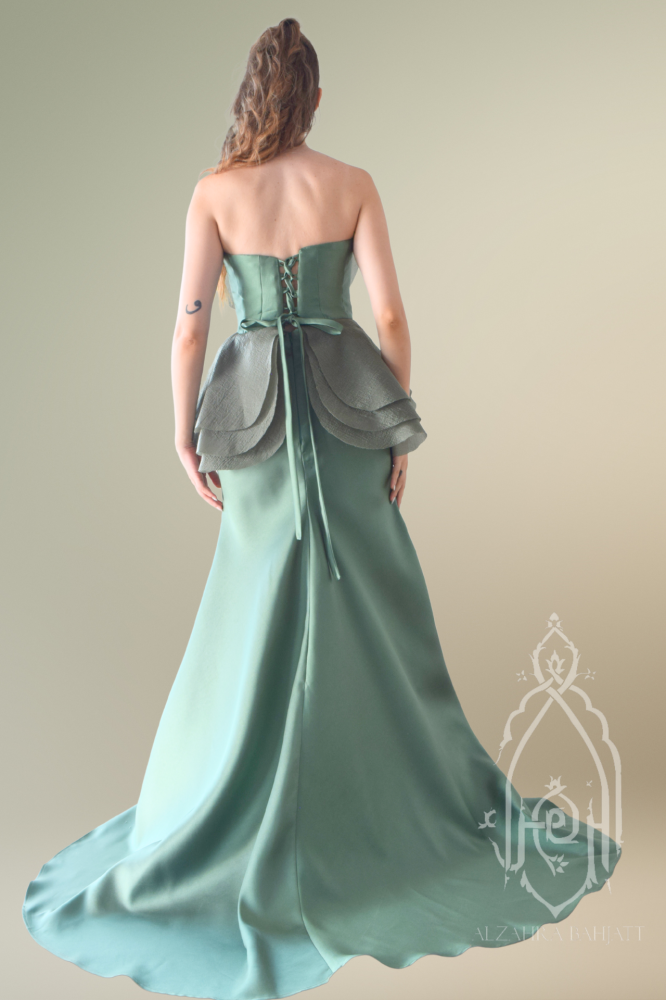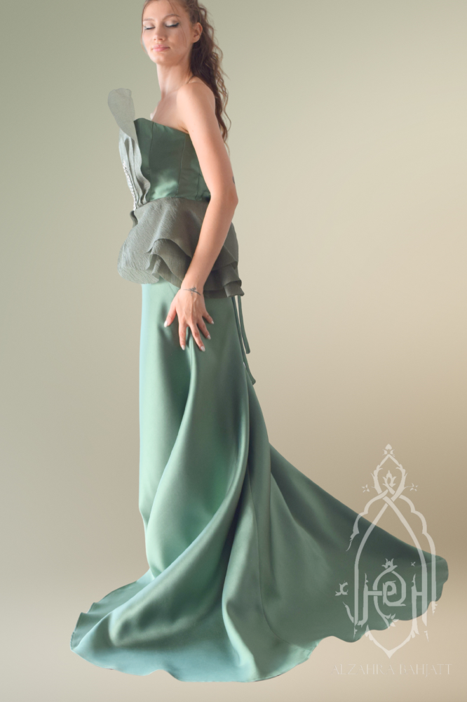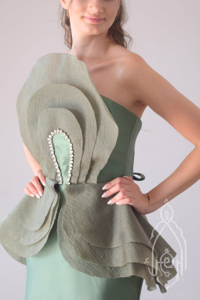 فستان سهرة فاخر باللون الأخضر الزيتي، مصنوع من كراب ستان ينساب بأناقة ويمنح حضورًا راقيًا.