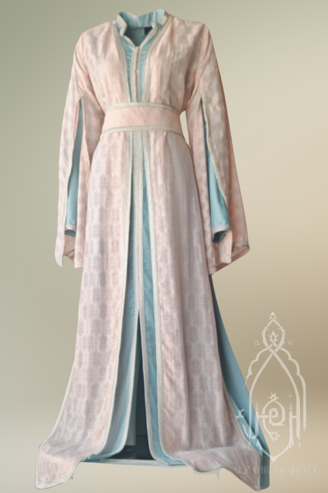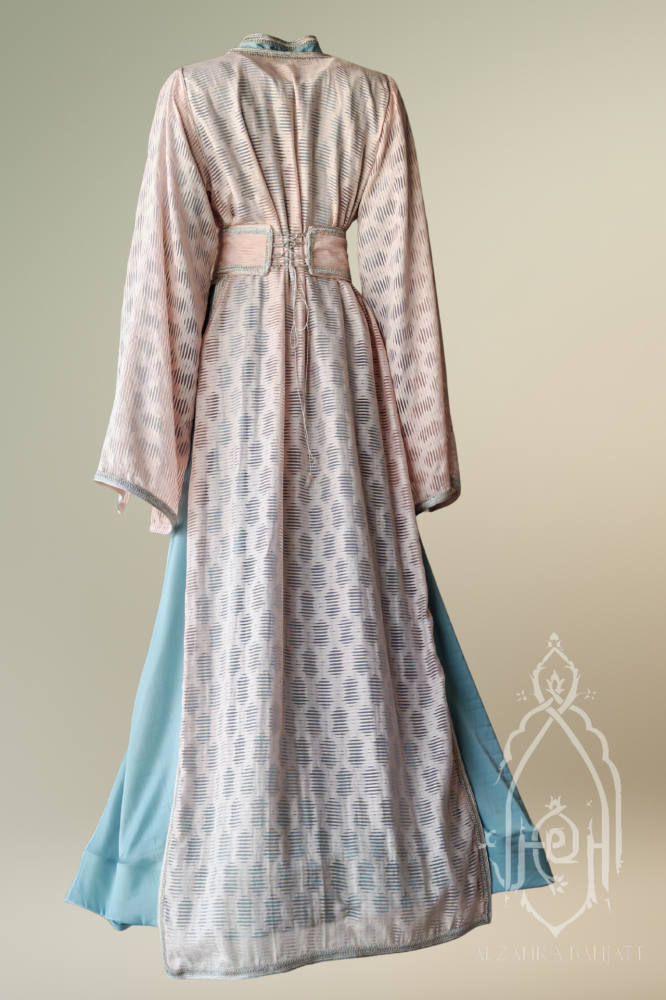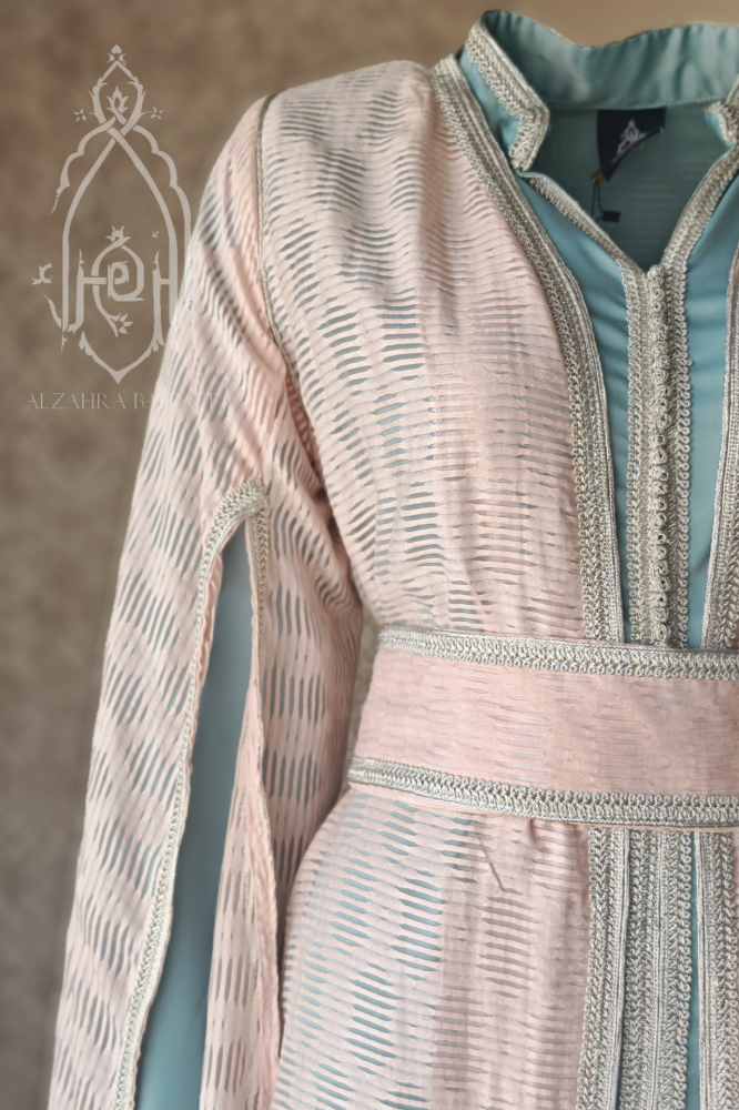 قفطان مغربي فخم يجمع بين اللونين البنك والأزرق الفاتح في تناغم يعكس الأناقة الهادئة.