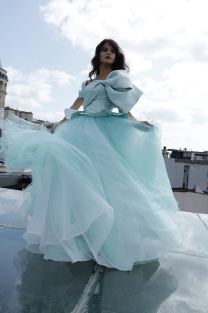 كورساج مزين بالفيونكات البارزة وباسك كلوش مع تنورة تل منفوش